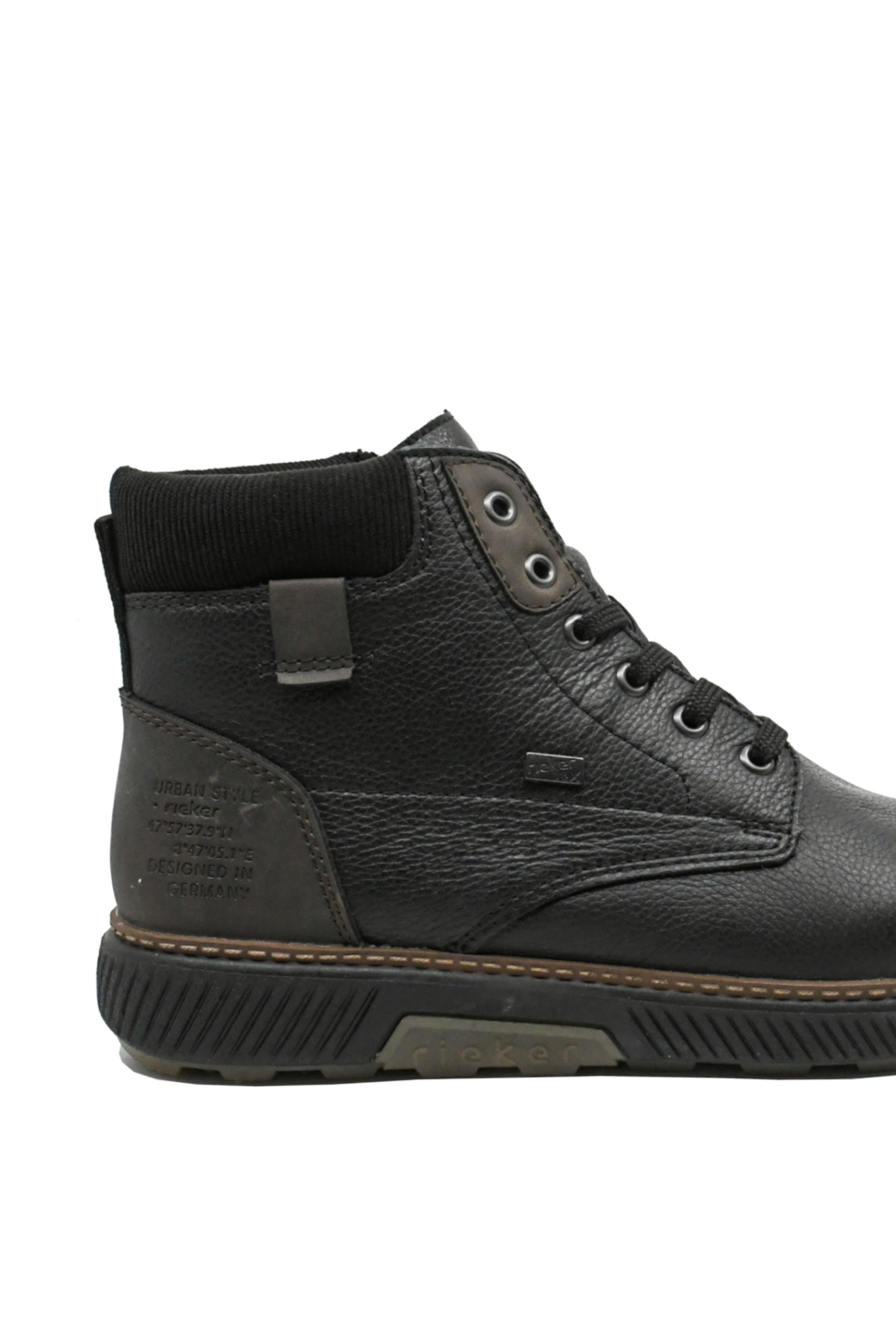 Bocanci bărbați Rieker, o opțiune ceva mai butucănoasă, din piele naturală cu granulații, calapod lat și interior călduros din lână naturală. Îi poți purta în diverse situații și momente, de la birou până la plimbări prin zăpadă.