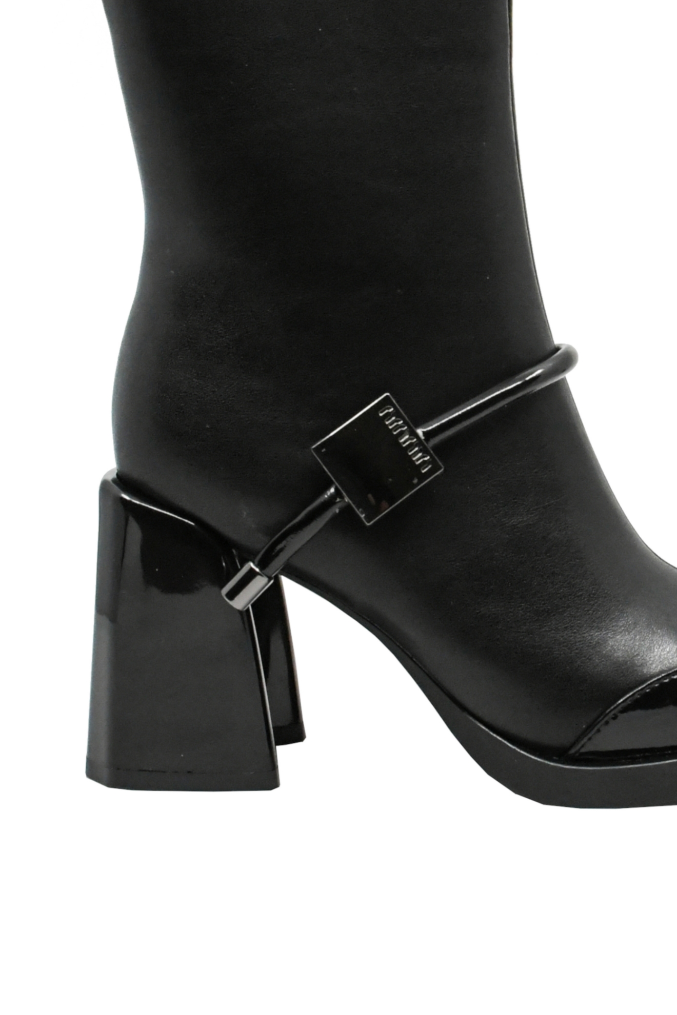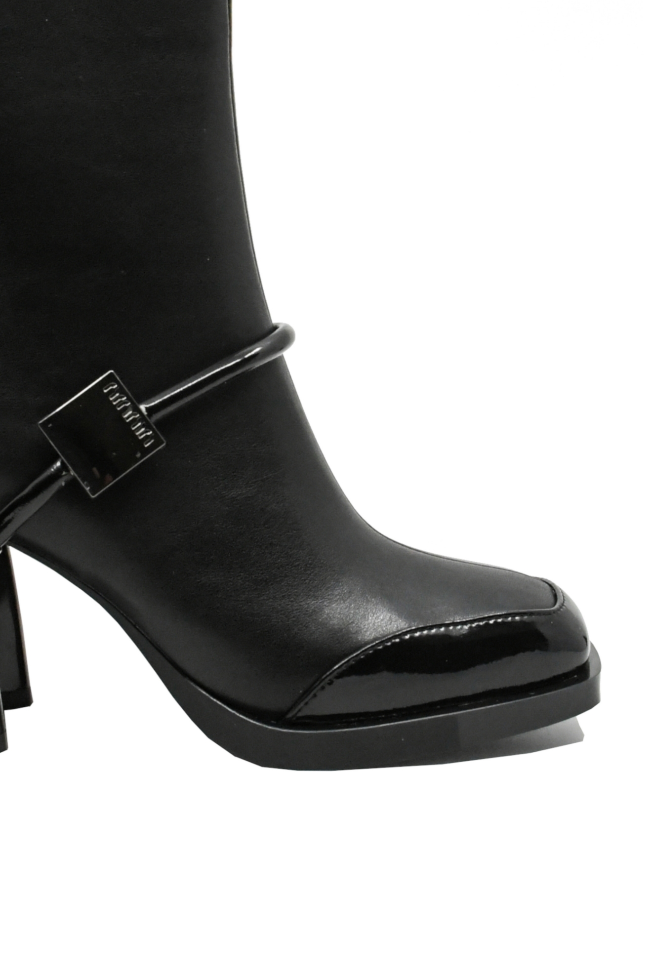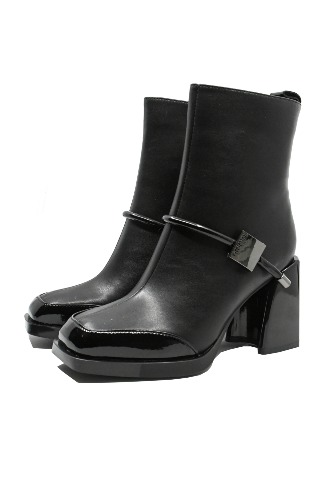 Botine elegante în stil retro, cu vârf pătrat din lac, toc masiv înalt cu aspect lucios și brățară elegantă cu plachetă metalică la gleznă. Cine nu ar da orice ca să le aibă în garderobă?