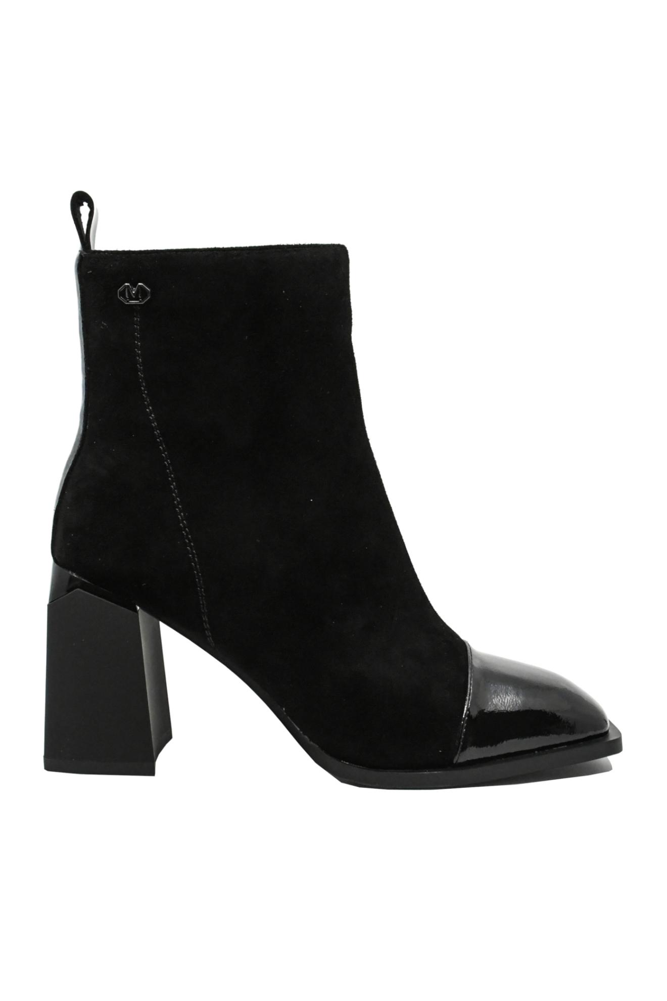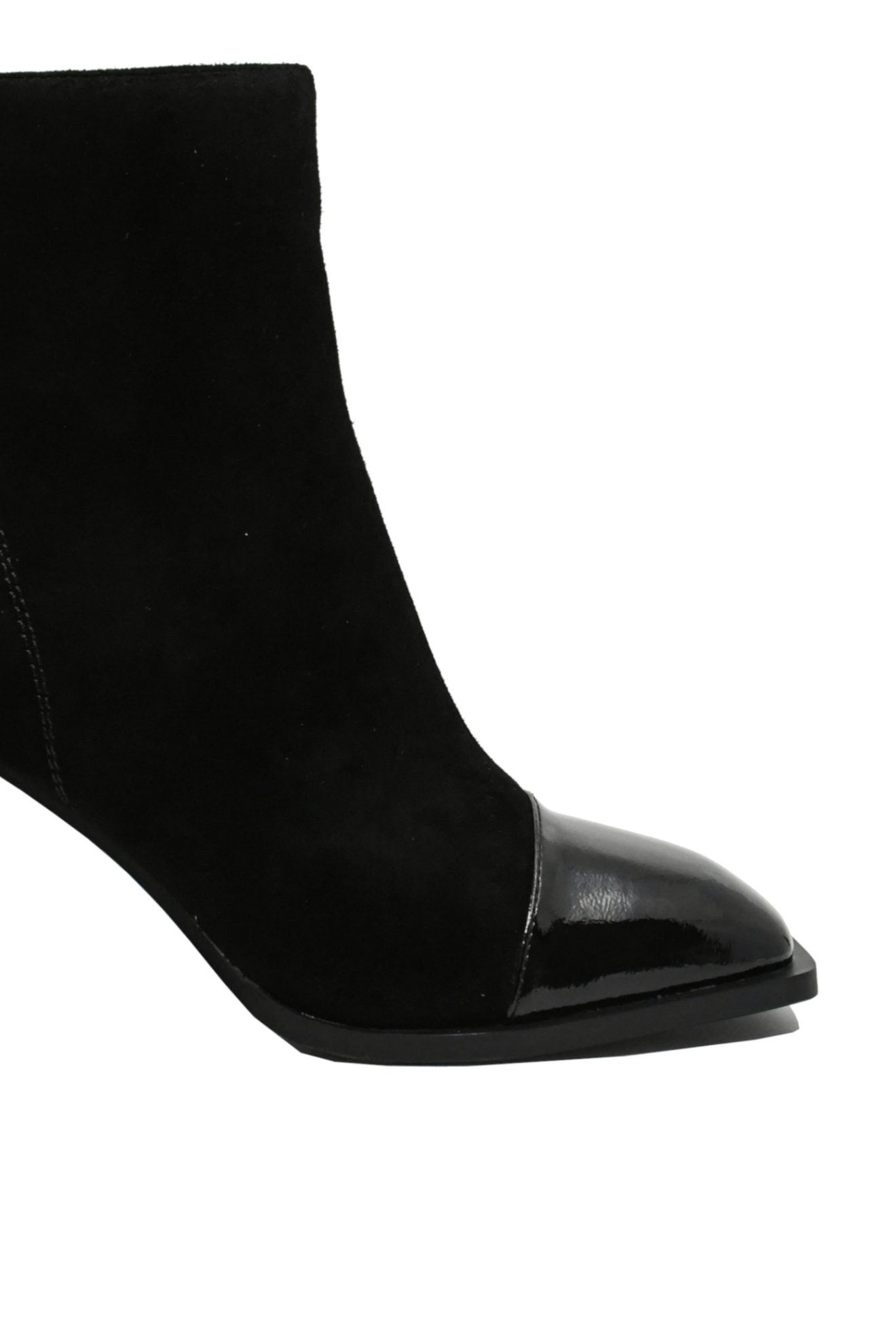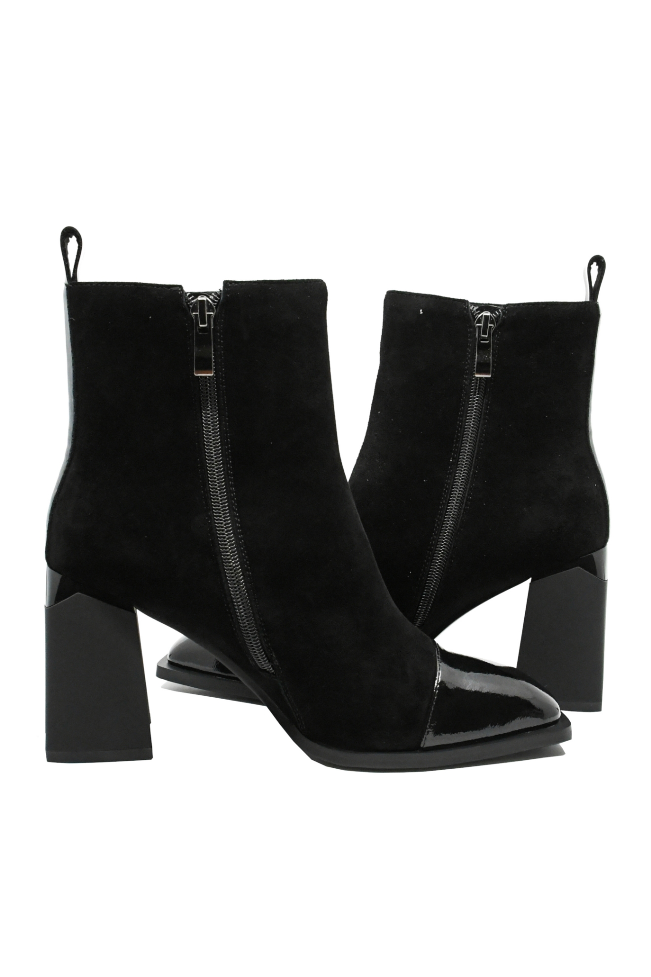 Botine damă elegante, un model clasic din velur, cu vârf pătrat chic din lac. Se observă silueta suplă, tocul masiv modern, iar interiorul călduros și moale se simte foarte bine și îți menține tonusul ridicat toată ziua.