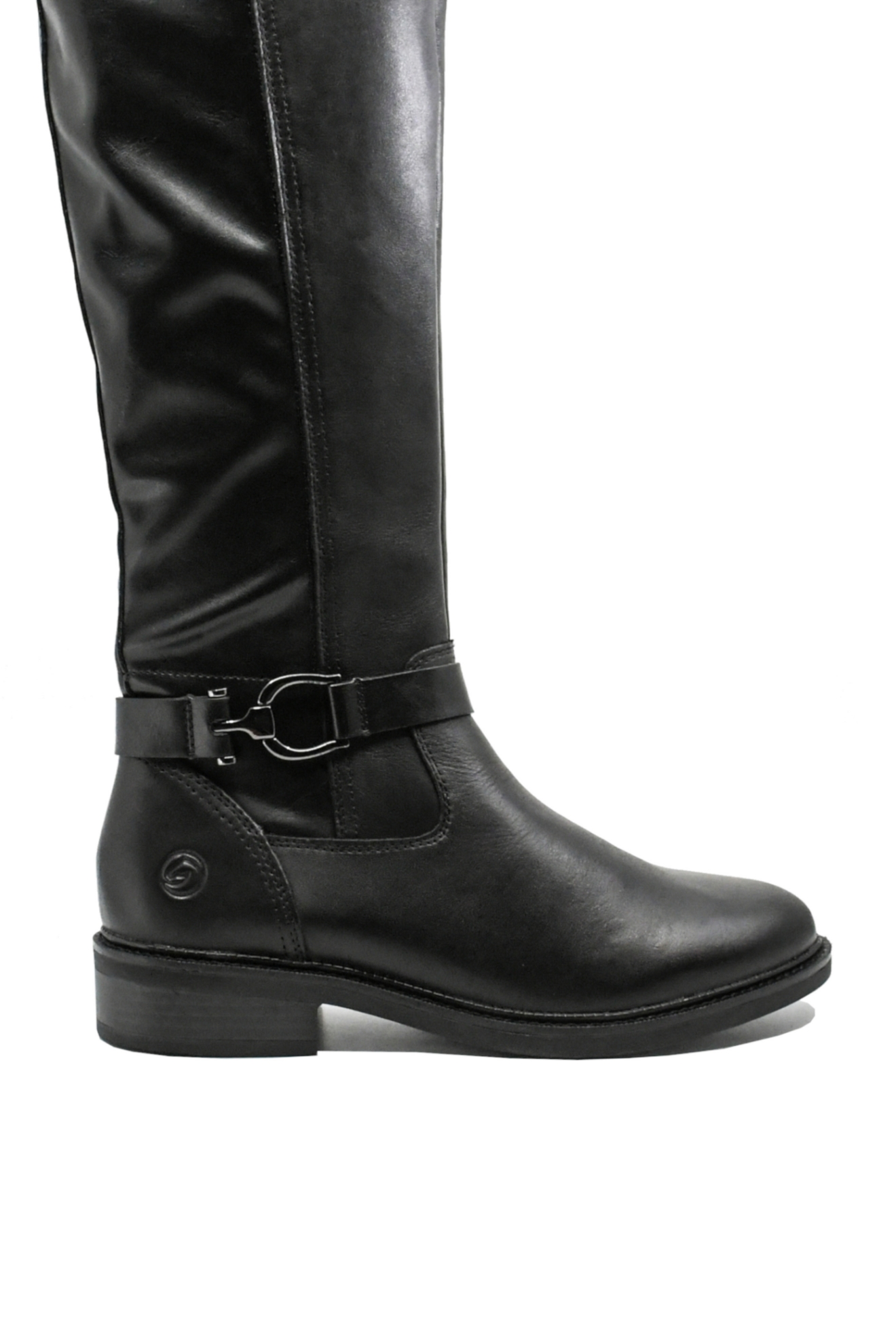 Cizme damă în stil ecvestru, înalte până la genunchi din piele naturală, cu interior căptușit și inserție din material flexibil în partea din spate ce se așează grozav pe picior.