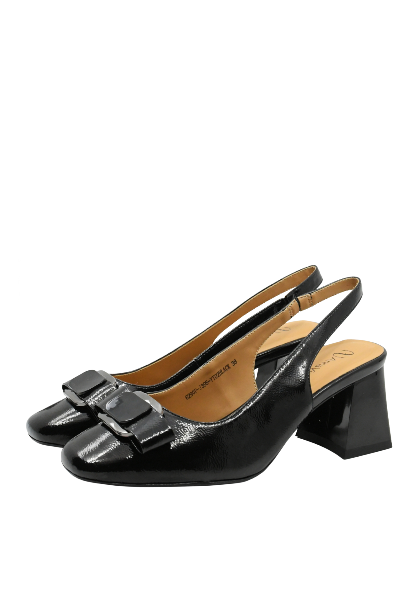 Pantofi superbi din lac, decupați la spate, cu toc butucănos, vârf pătrat și fundiță decorativă. Asorteazaă-i cu un costum sobru la serviciu, sau cu o rochie elegantă pentru o ieșire de seară. Stilați, confortabili, un model trendy cu look clasic, perfect pentru ocazii formale sau de business.
