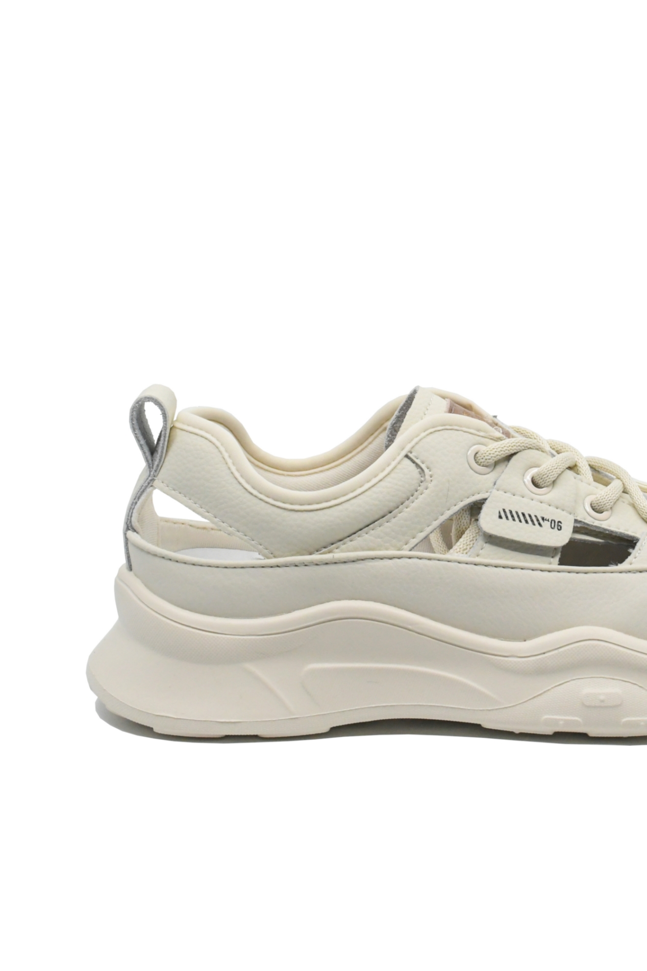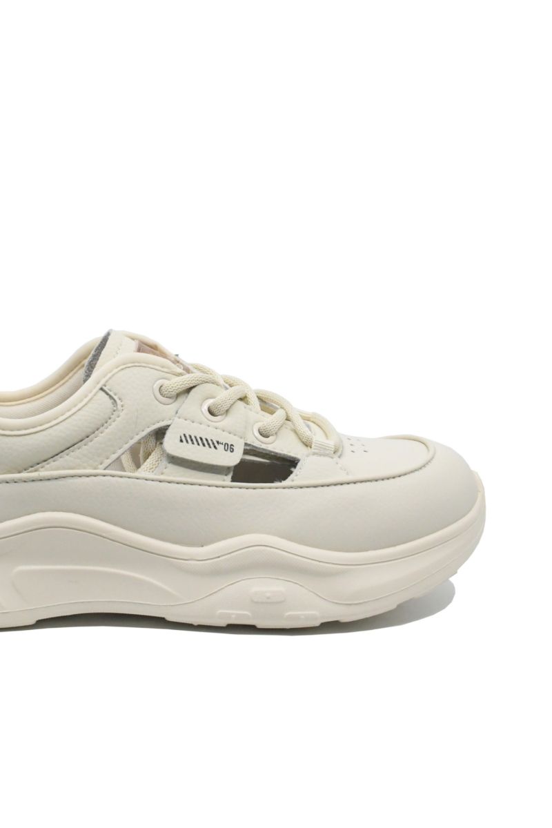 Pantofi sport de vară cu decupaje, moderni și plini de farmec, cu o estetică simplă, curată, într-o nuanță de crem deschis. O singură pată de culoare la logo-ul de pe limbă este suficientă ca să atragă atenția.