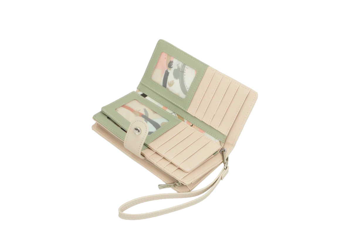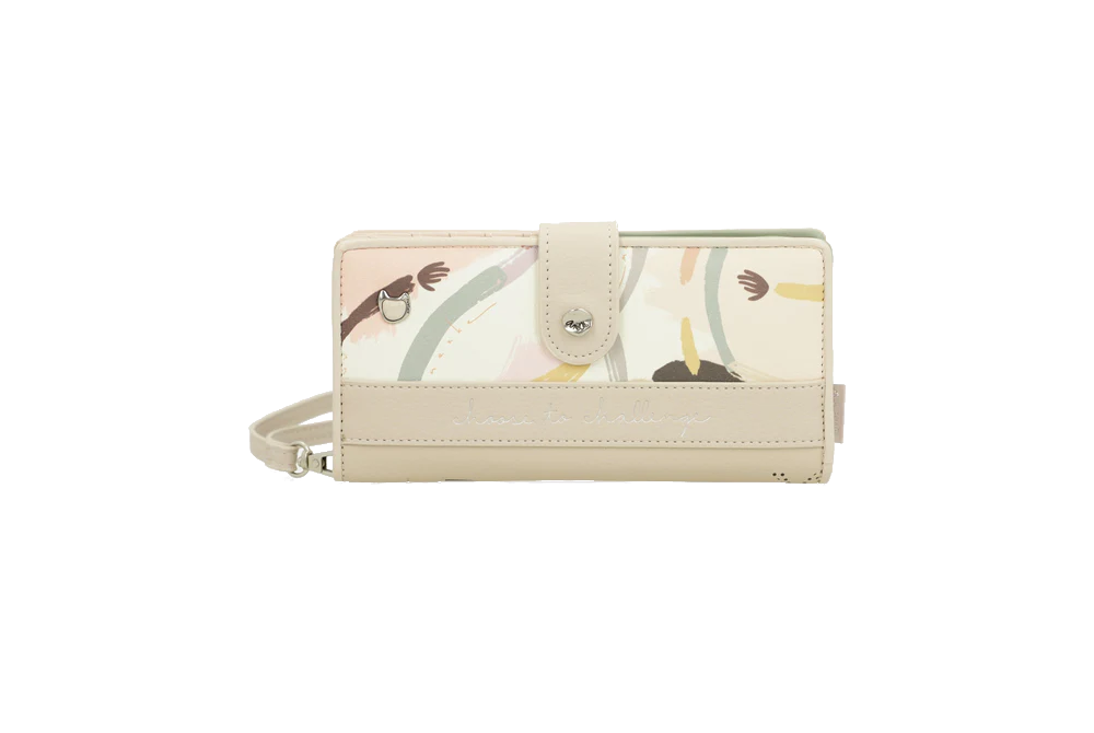 Portofel Anekke bej cu print, protecție RFID și două compartimente cu închidere cu fermoar și clapetă. Modelul face parte din colecția Alma, inspirată de călătoria în Spania, țara natală a Anekke. Detaliile decorative, texturile și culorile sunt simboluri reinterpretate din cultura spaniolă, un tribut acordat bogăției acestei țări.