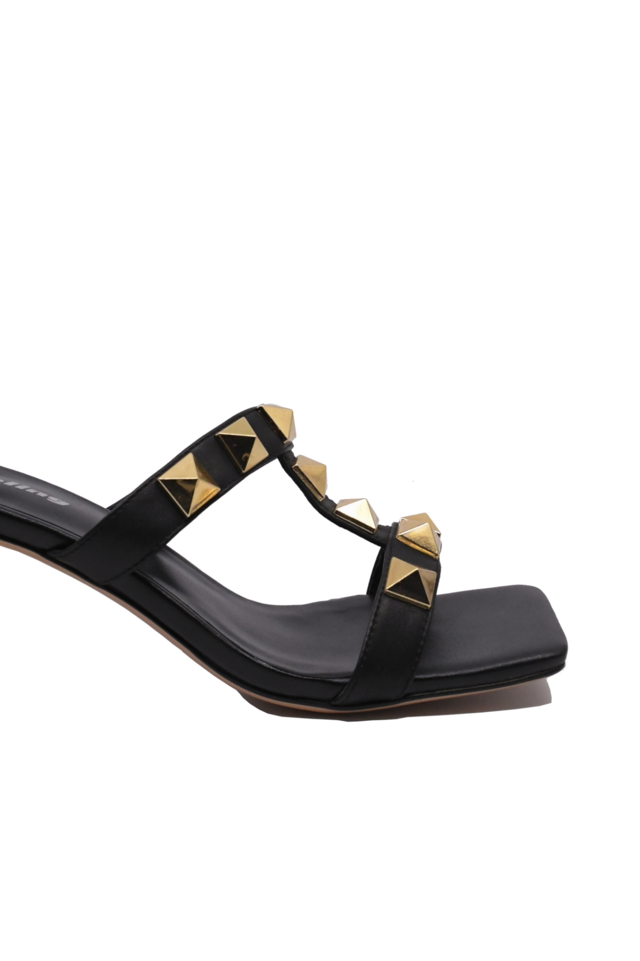 Cei mai doriți saboți, cu ținte decorative aurii oversize, vârf drept și toc piramidal confortabil cu inserție oglindă. Toată lumea aruncă o a doua privire.
