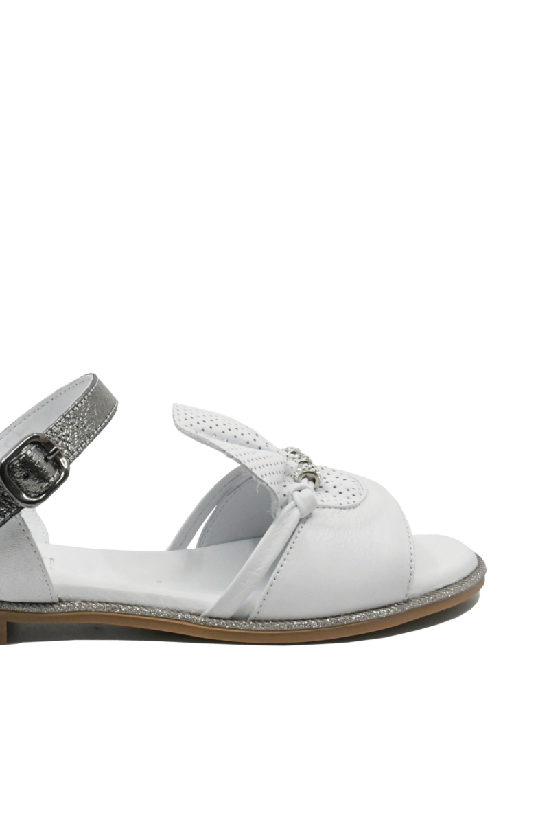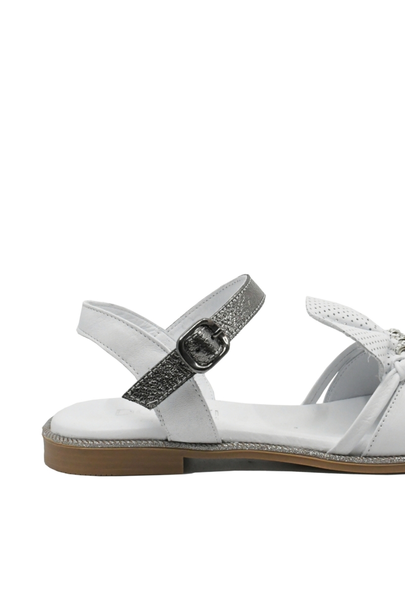 Sandale damă cu talpa plată, accesorizate cu charmuri și strasuri, la fel ca o veritabilă sanda de seară. Culoarea albă, bareta metalică și marginea argintie a tălpii completează foarte frumos ansamblul.