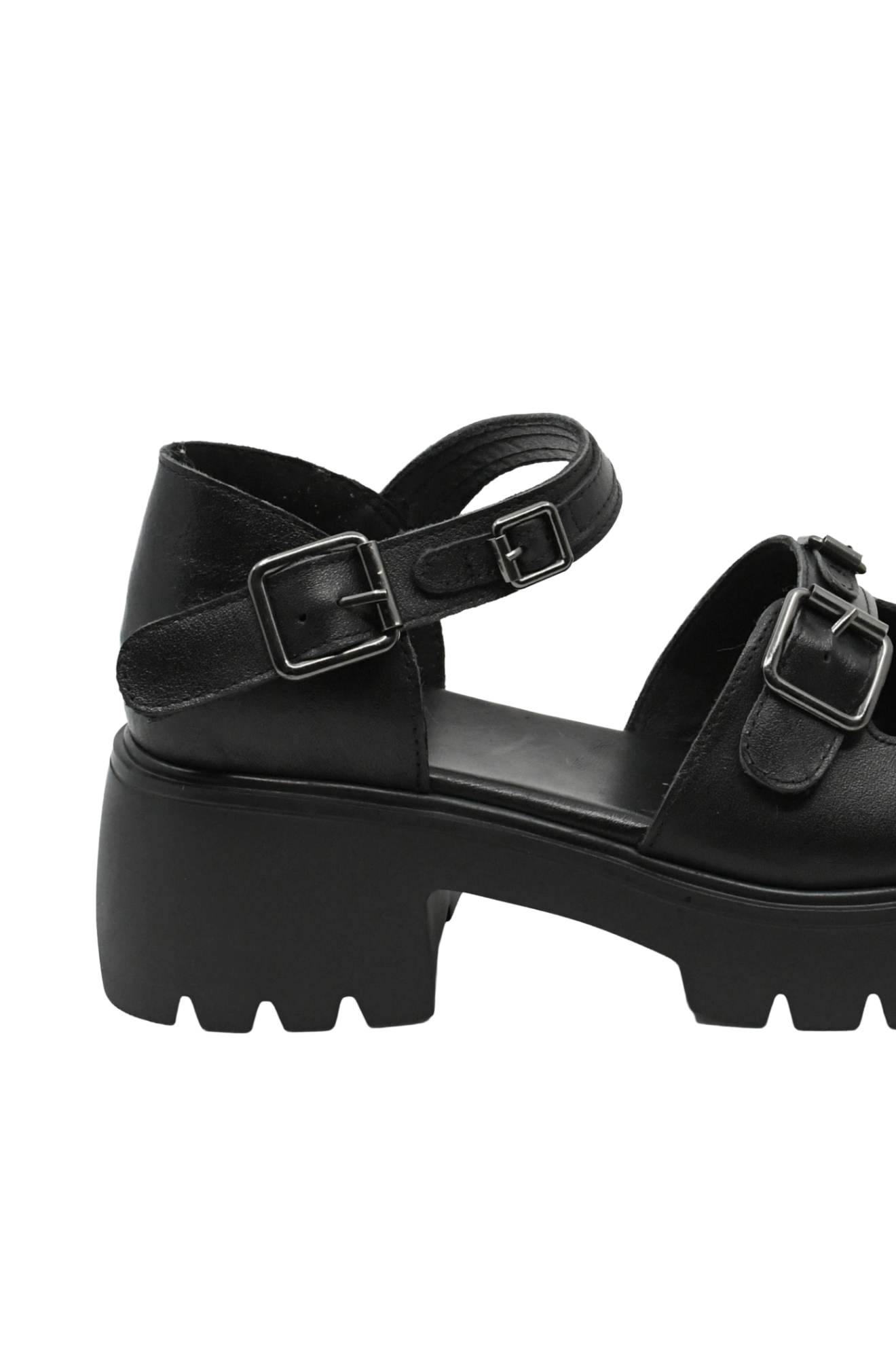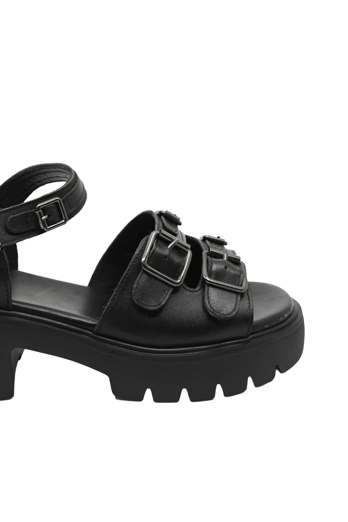 Sandale damă cu platformă, în două barete cu numeroase catarame metalice decorative, un accent care evidențiază stilul sport modern și atractiv.