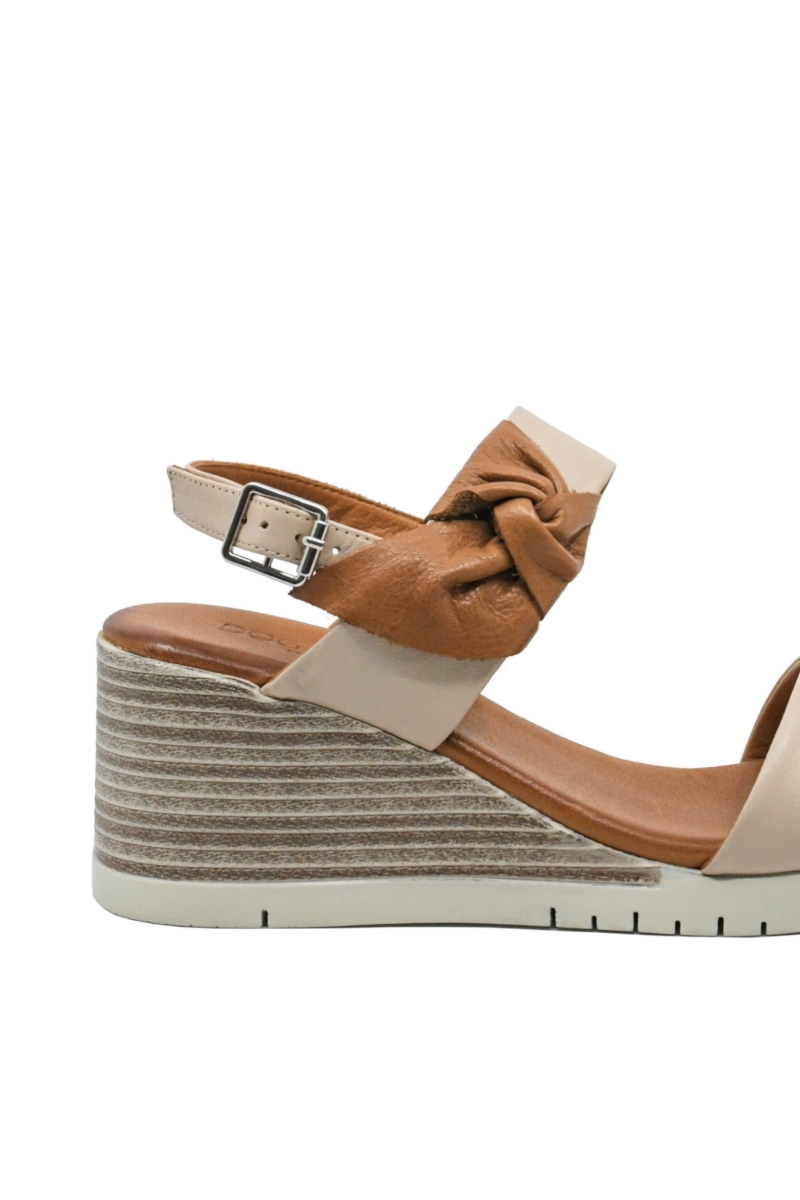 Sandale damă moi, comode și suportive, cu talpa wedge îmbrăcată în piele model coajă de cocos și baretă simplă cu aplicație fundiță. Poți petrece toată ziua cu ele în picioare și să te simți grozav.
