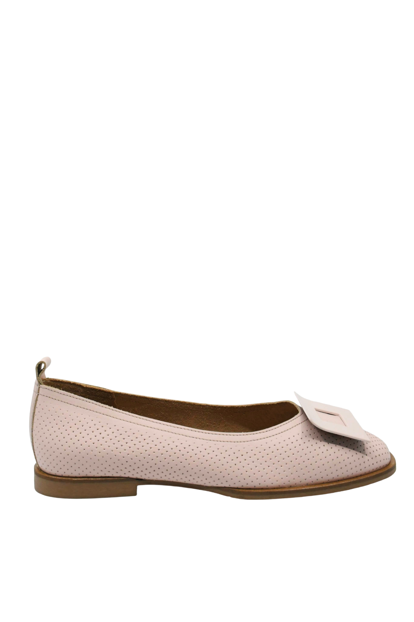 Balerini damă de un roz deschis și cu aspect perforat, cu care faci o declarație subtilă dar puternică în același timp. Vârful pătrat și aplicația decorativă sofisticată în formă de cataramă îți accentuează look-ul cu dramatismul lor elegant.