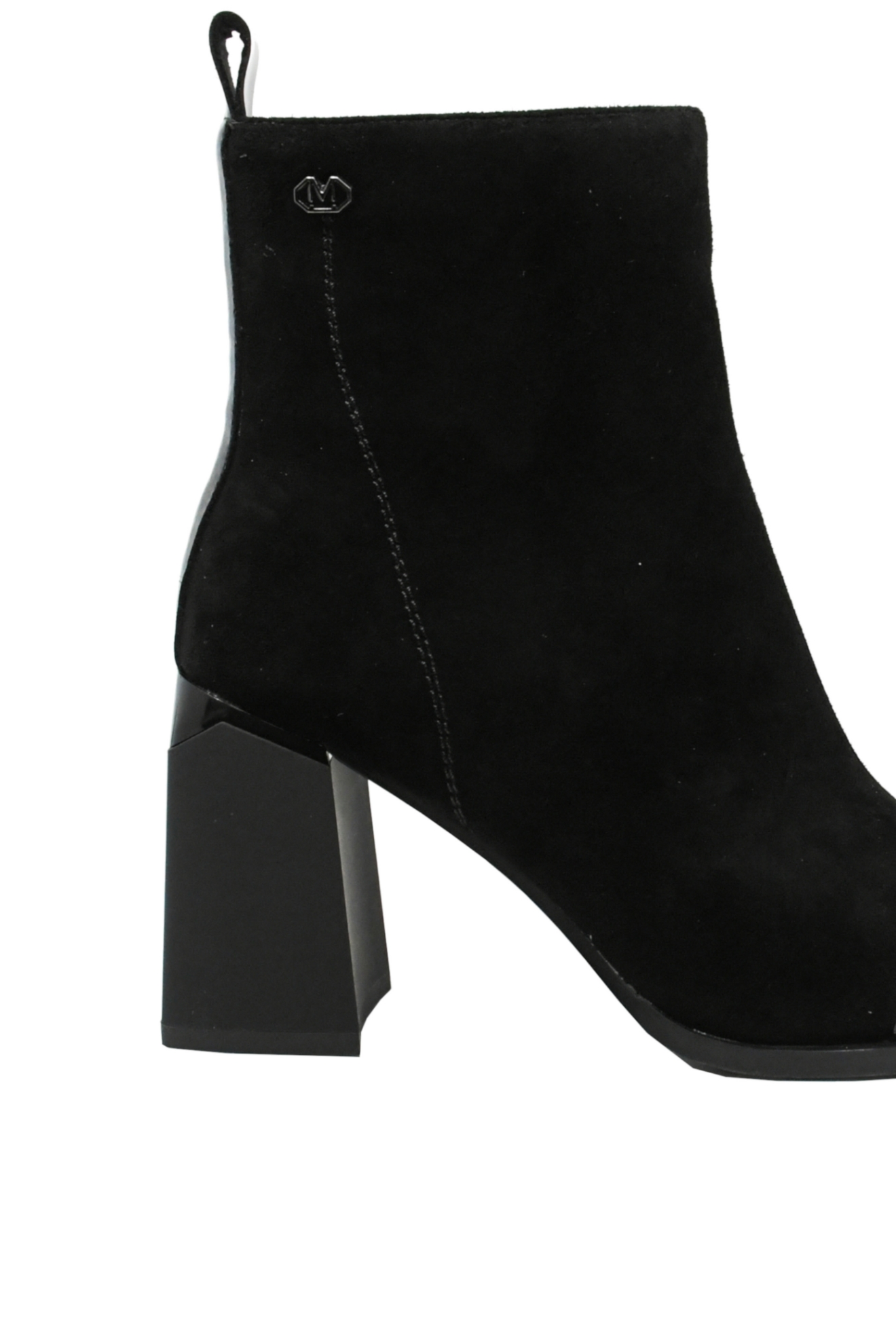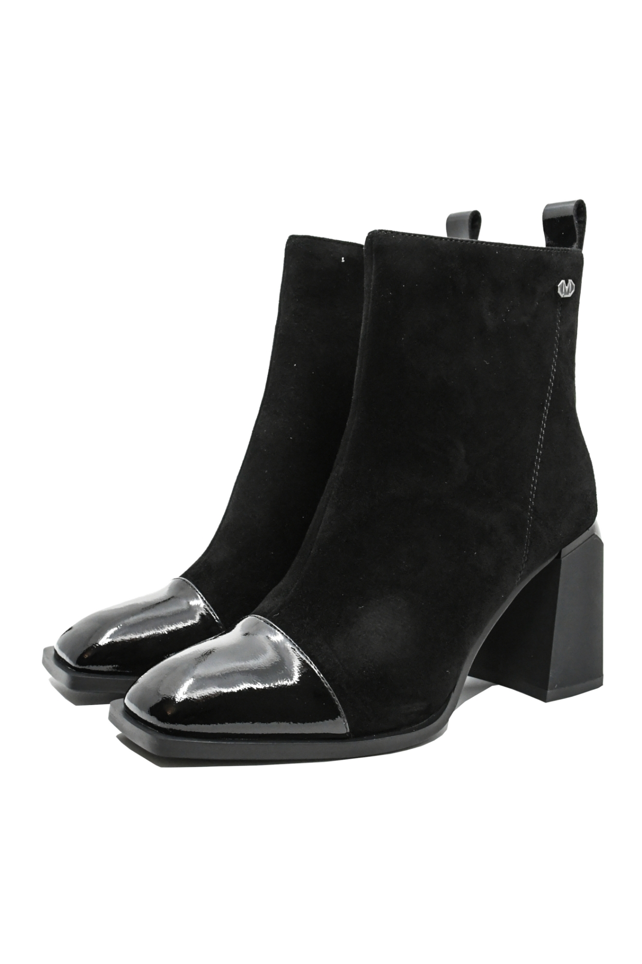 Botine damă elegante, un model clasic din velur, cu vârf pătrat chic din lac. Se observă silueta suplă, tocul masiv modern, iar interiorul călduros și moale se simte foarte bine și îți menține tonusul ridicat toată ziua.