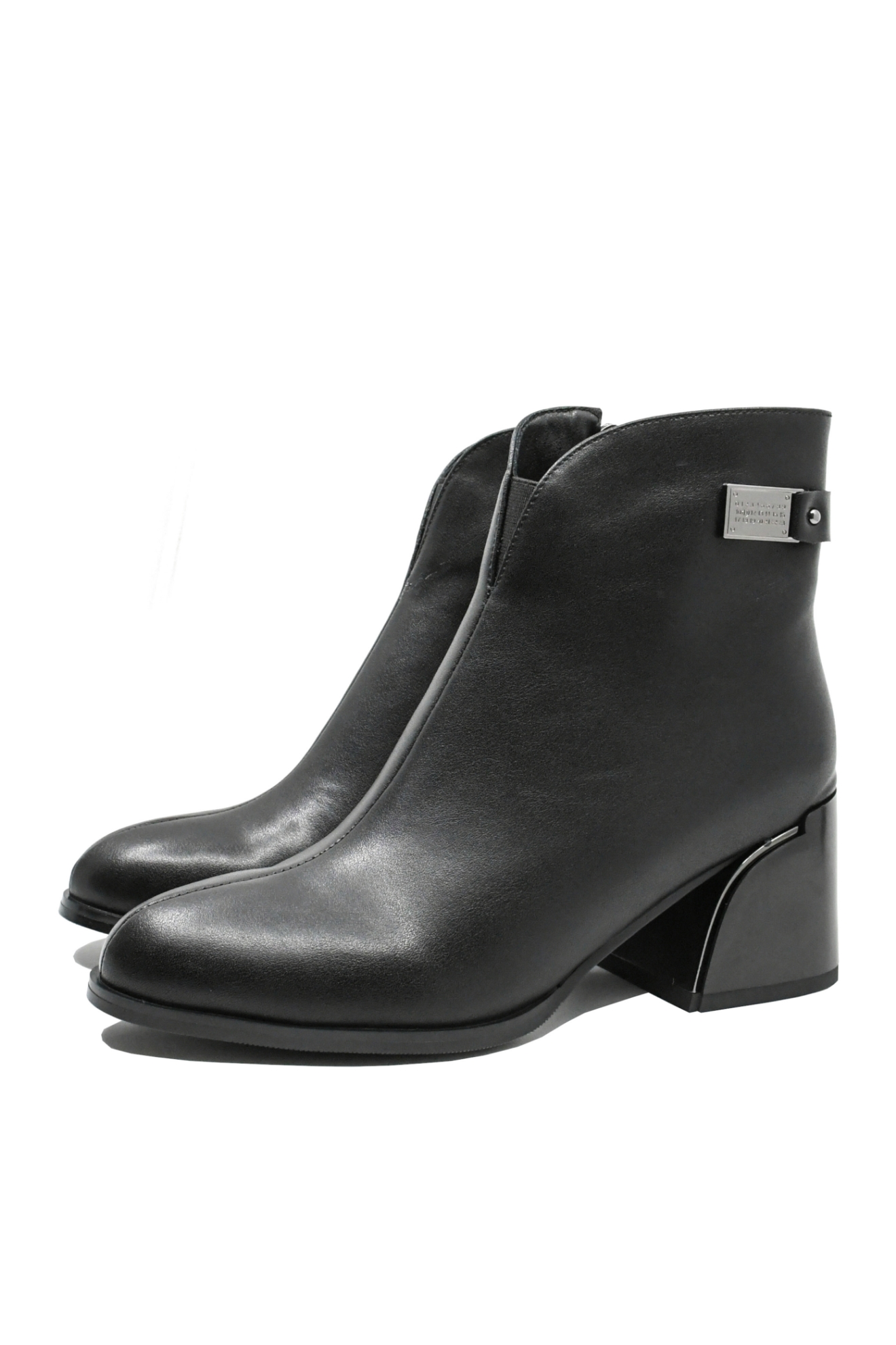 Botine damă până la gleznă, cu toc masiv arcuit și plăcuță metalică decorativă. Merg cu absolut orice ținută, adăugând acel ceva, acel plus de eleganță, fără să distragă și fără să renunți deloc la confort.