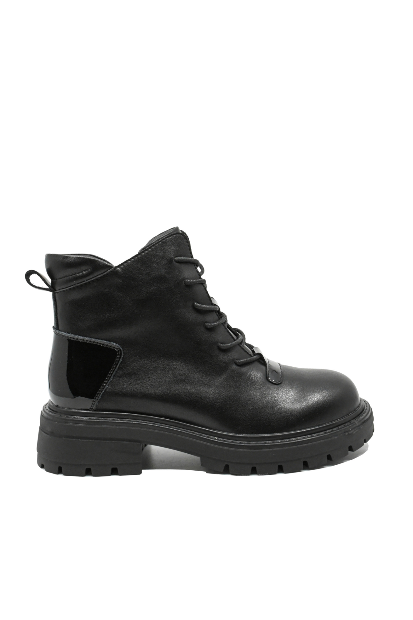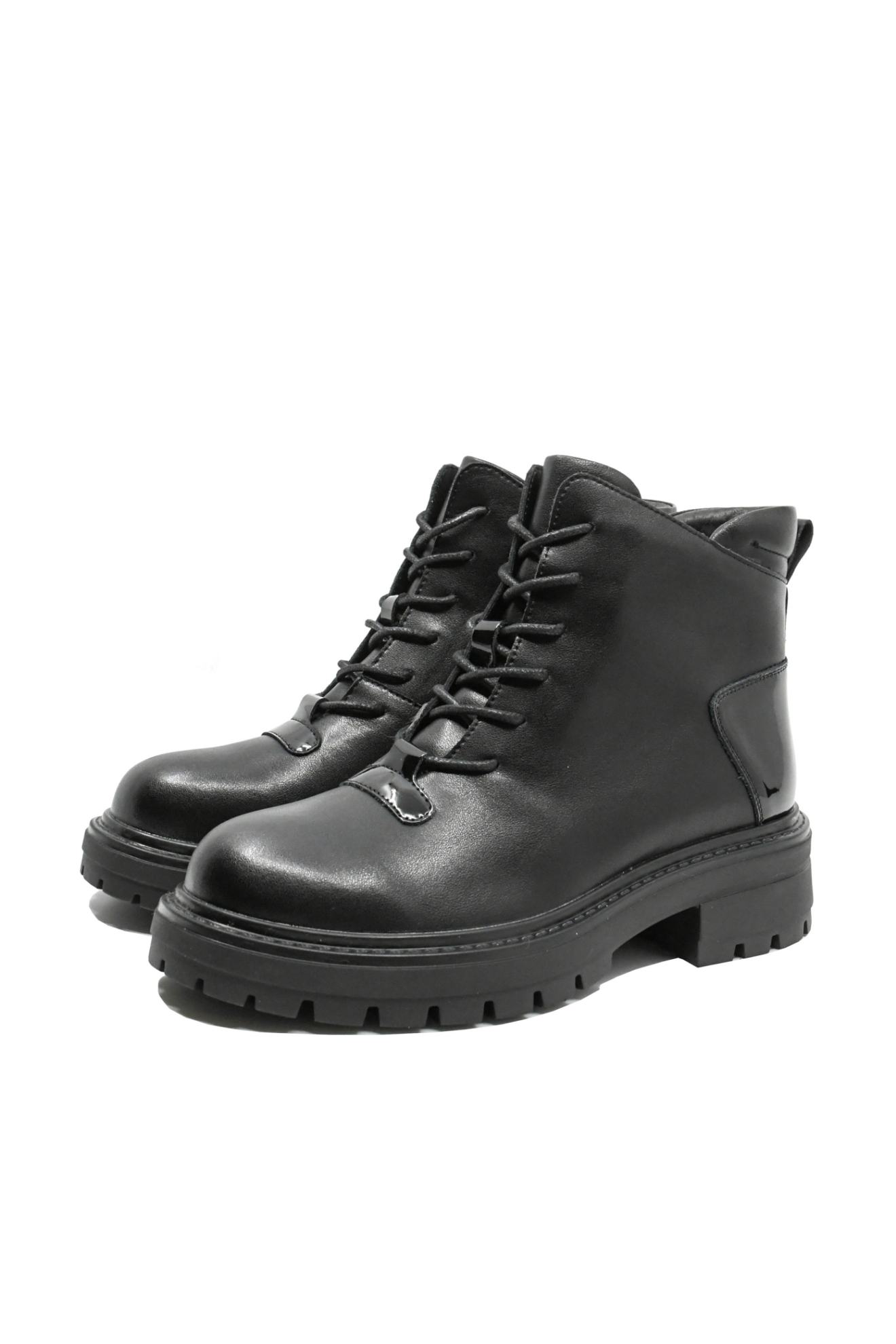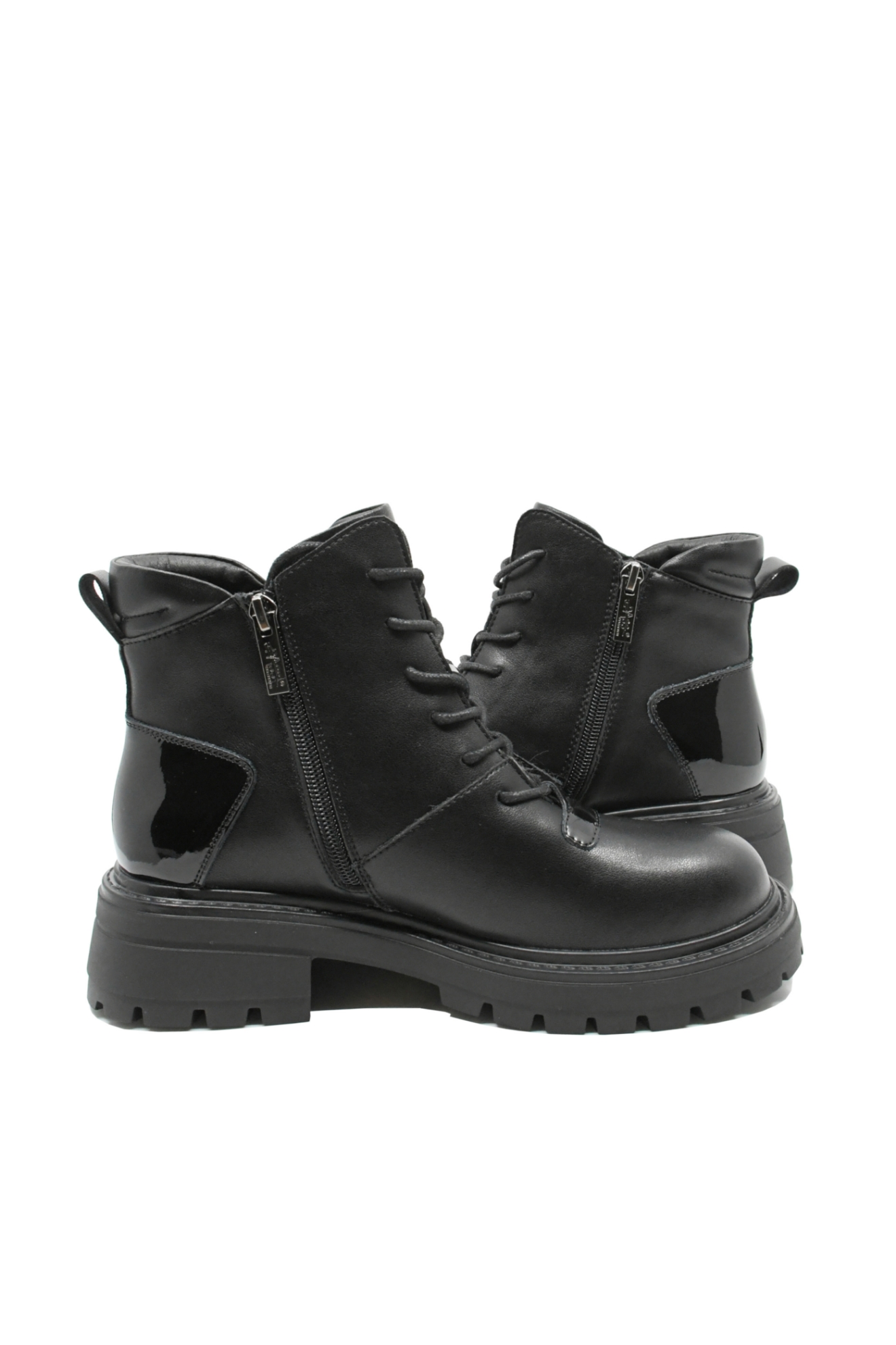 Ghete damă până la gleznă de un negru extrem de profund, cu platformă masivă și detalii decorative din lac lucios la câlcâi și în față, pentru mers oricând și oriunde toată iarna.