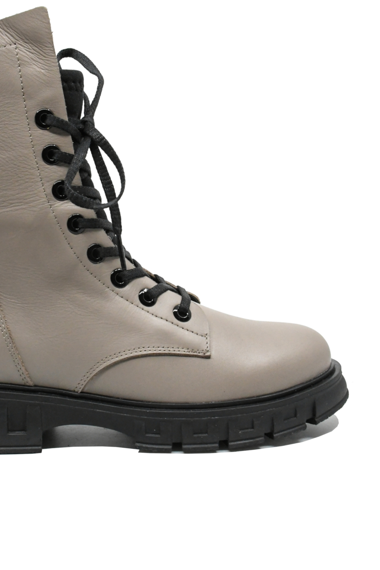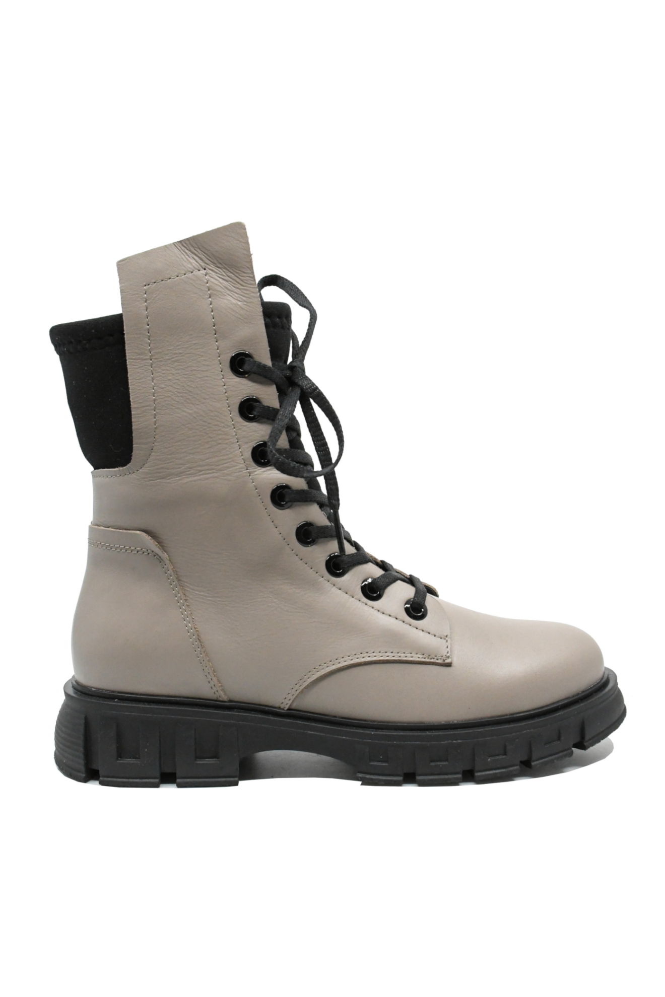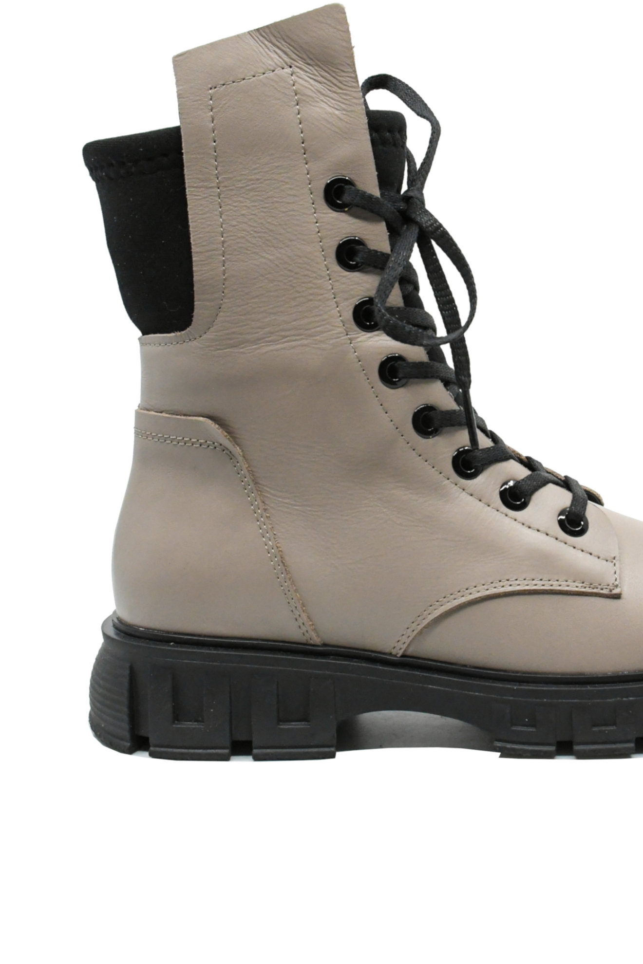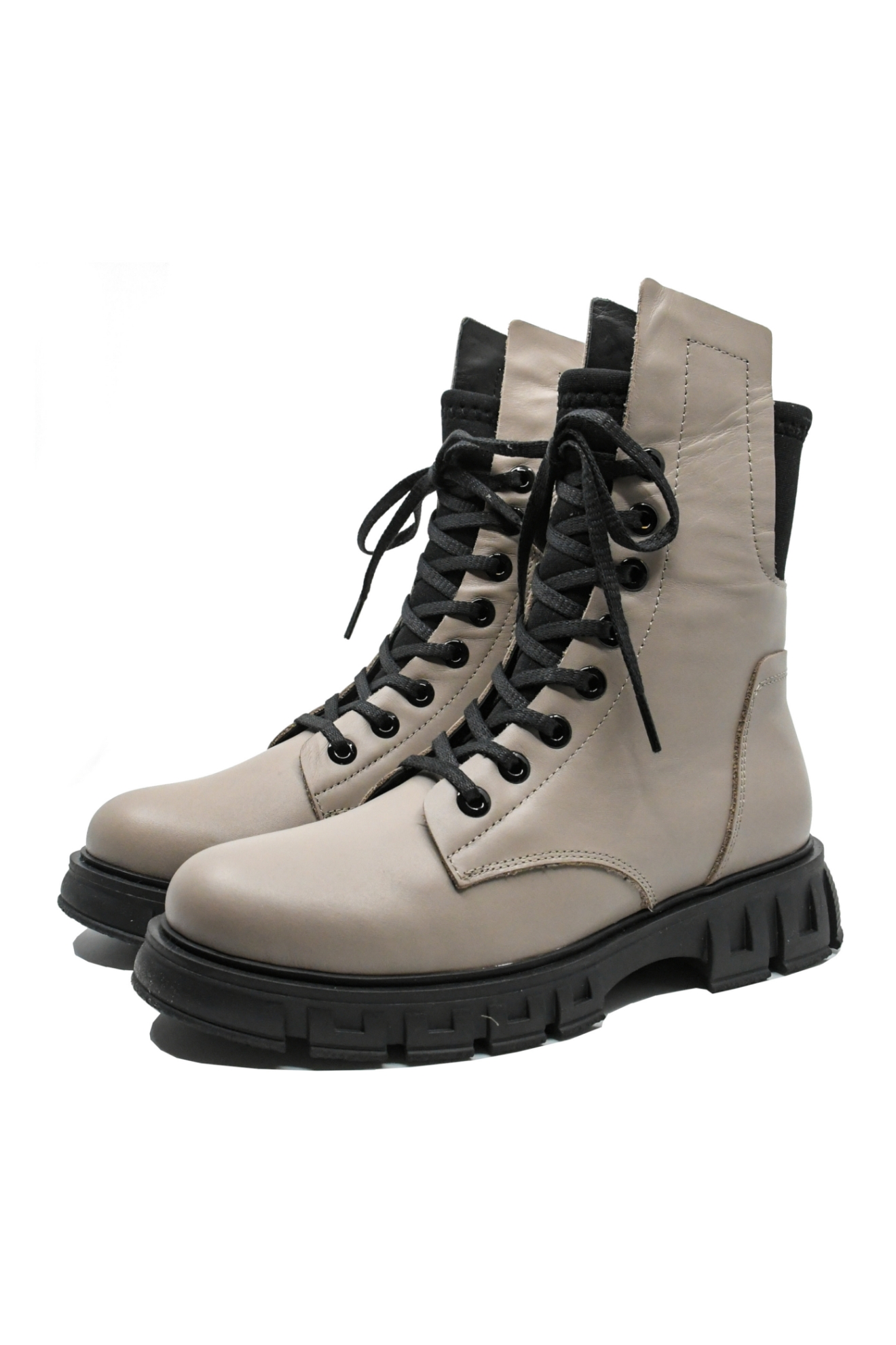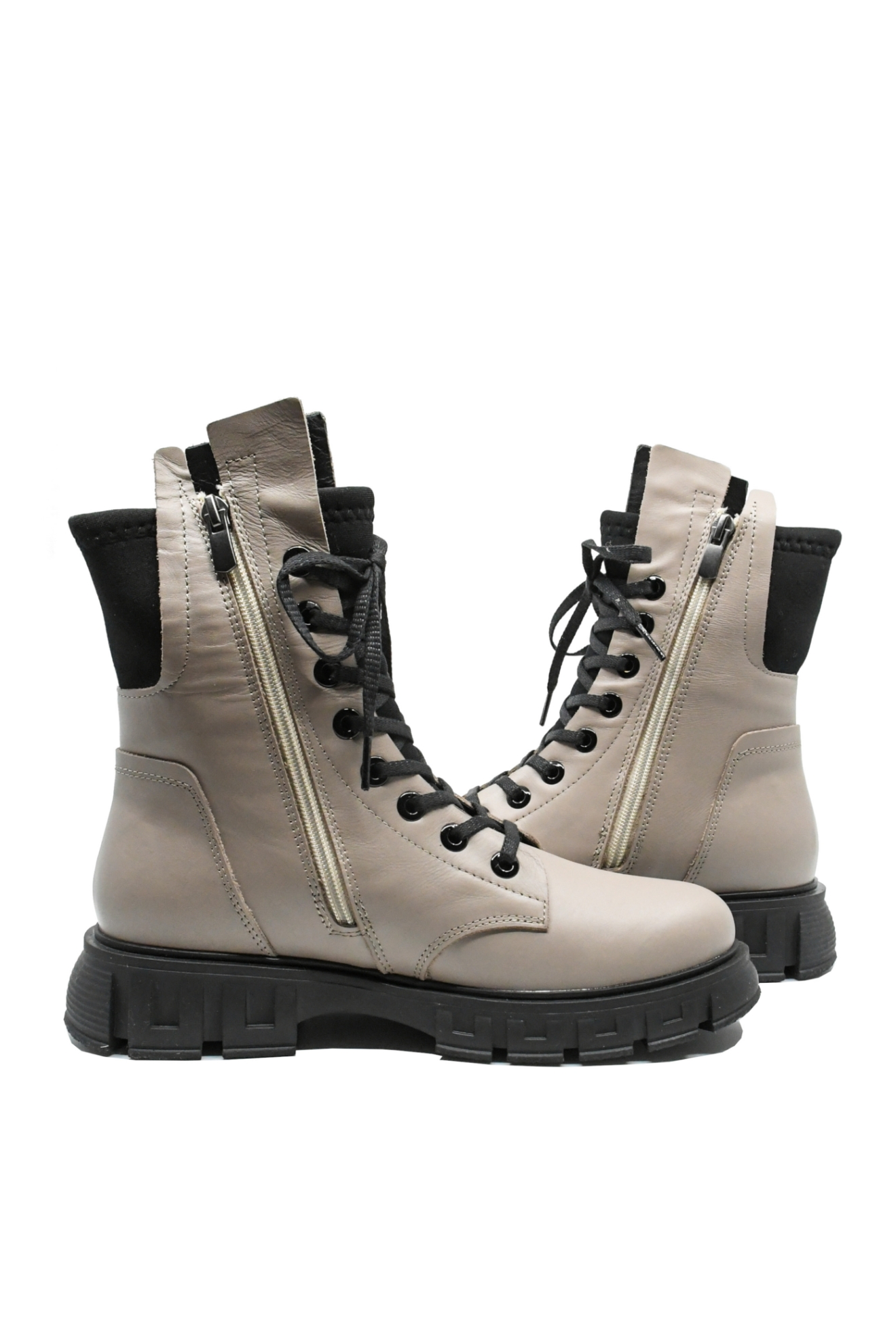 Ghete damă casual, disponibile în două culori, gri vizon și negru, cu talpa înaltă cu margine decorativă, șiret lung până sus și carâmb înalt cu inserție din material textil moale.