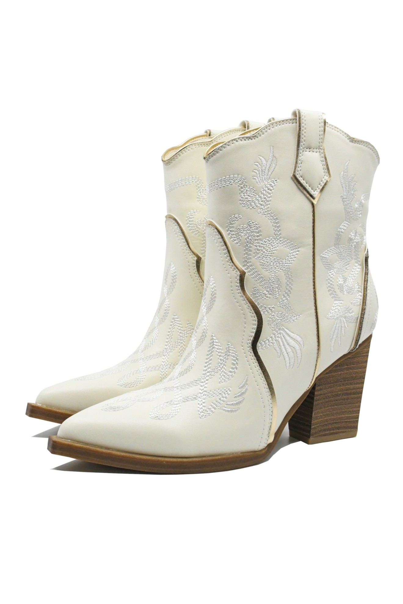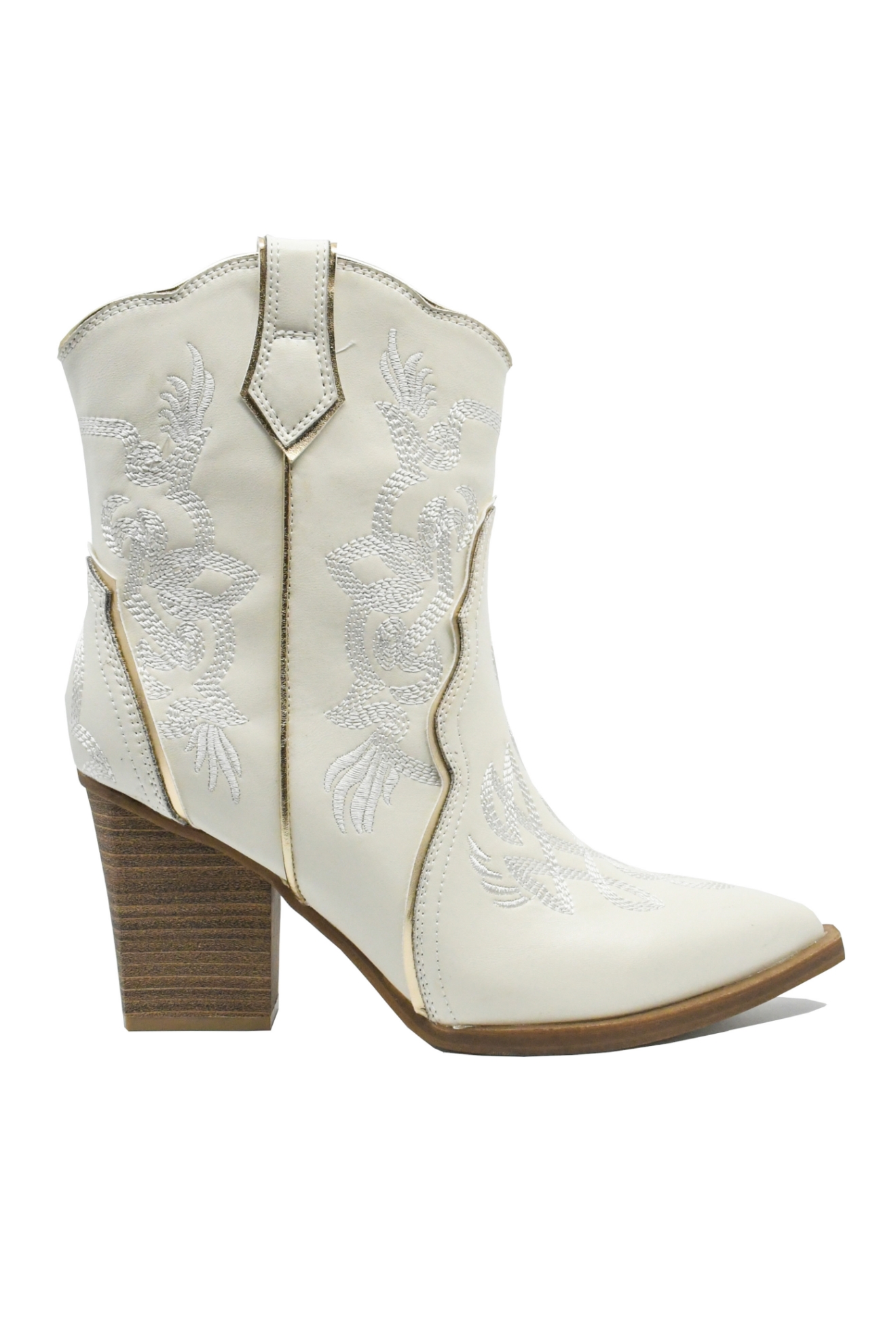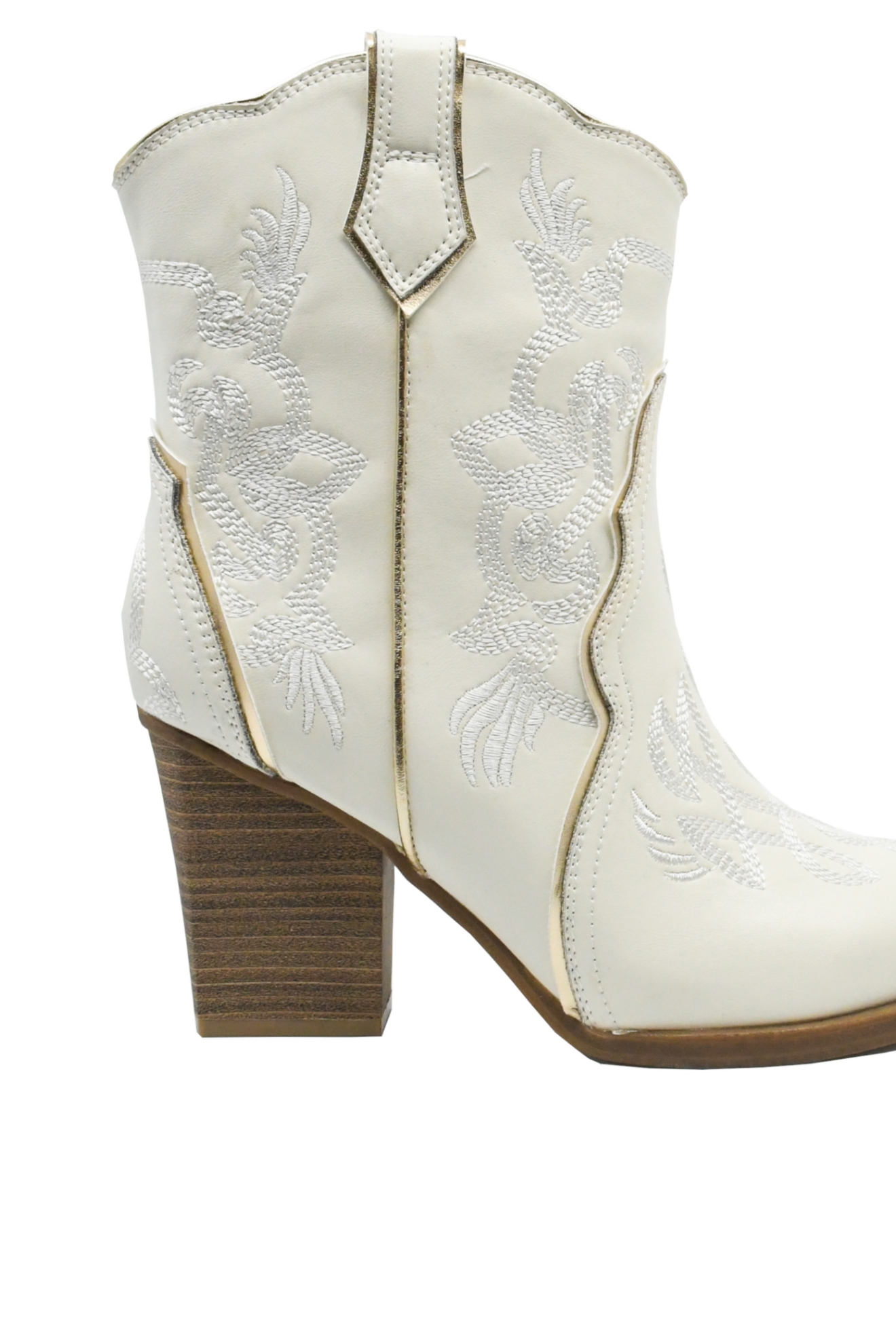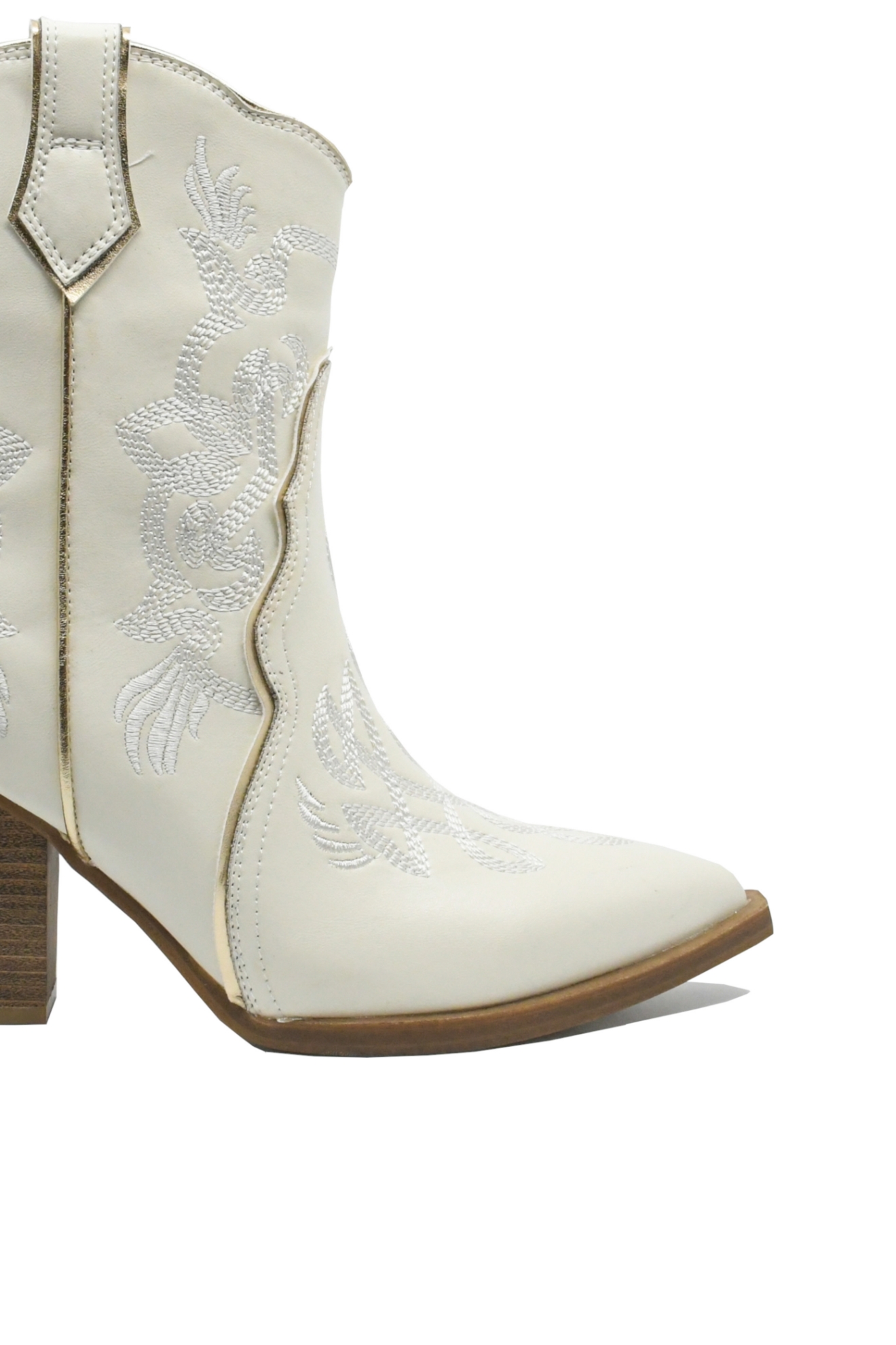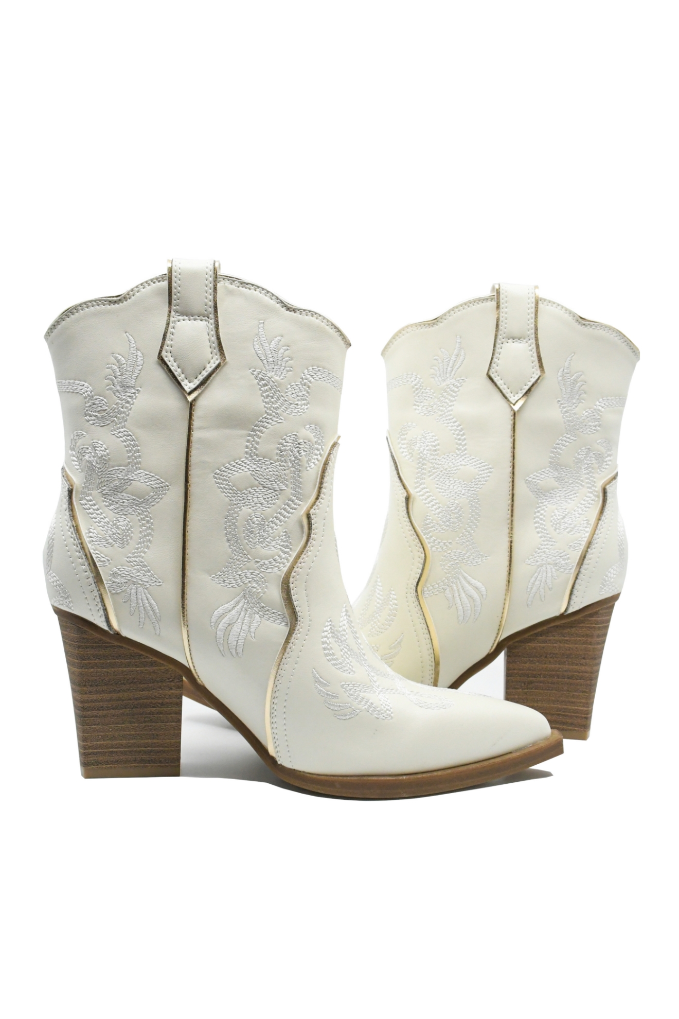 Ghete damă ciocate, stil western modern, de un alb superb, cu broderie intricată în aceeași culoare și cu detalii aurii. Robuste și bine făcute, cu aspect luxos, te conving de la distanță, mai ales dacă stilul cowboy este în topul preferințelor tale.
