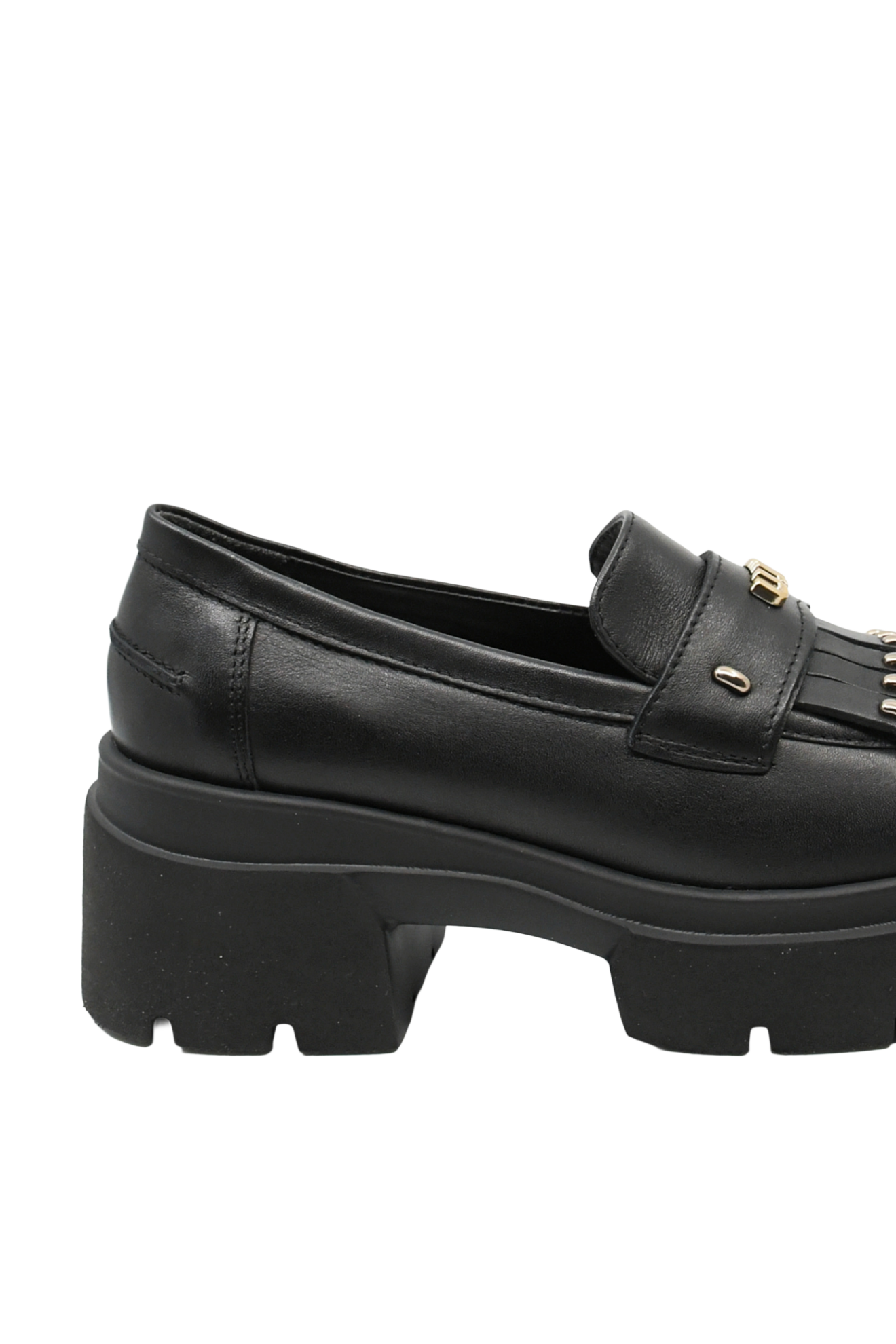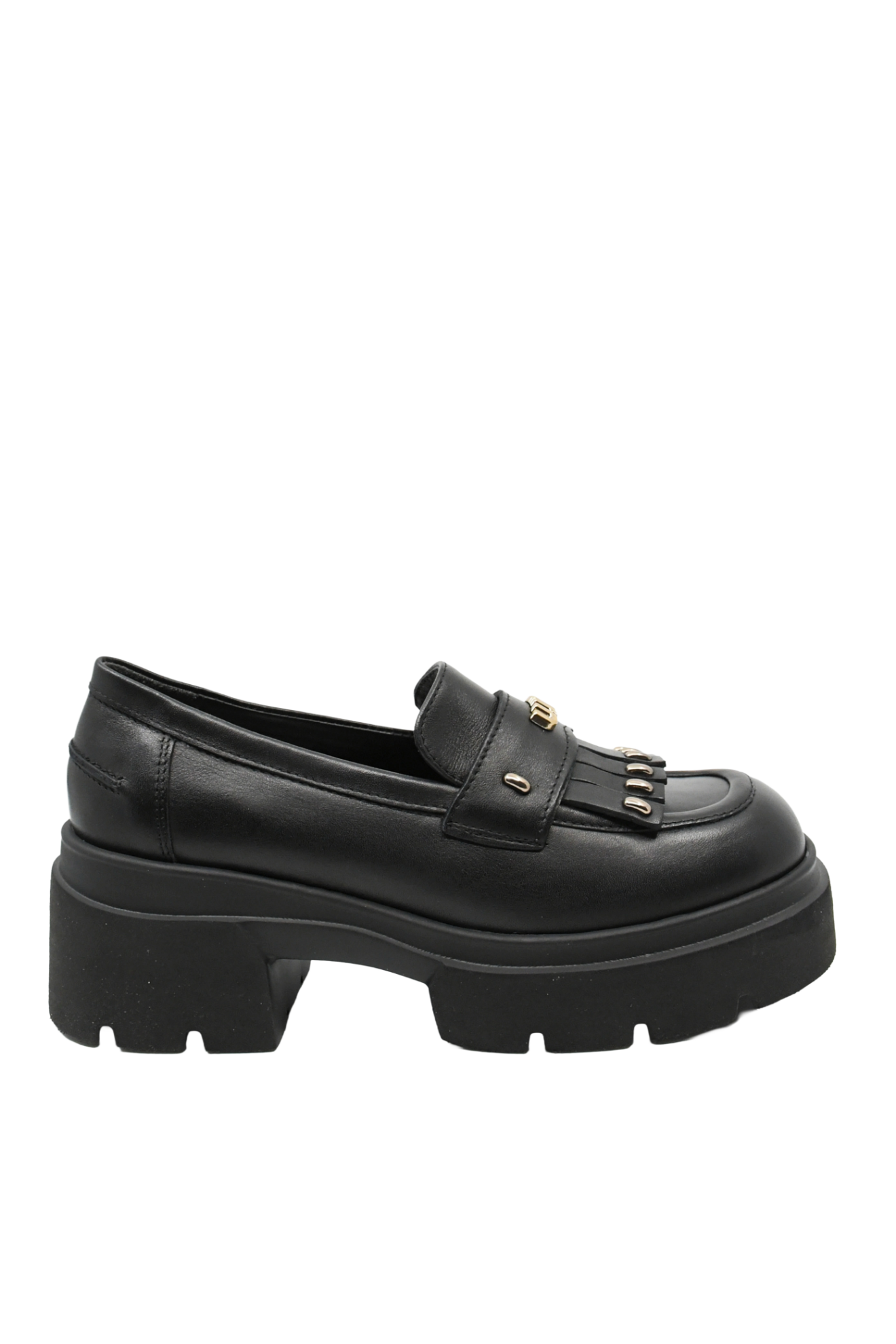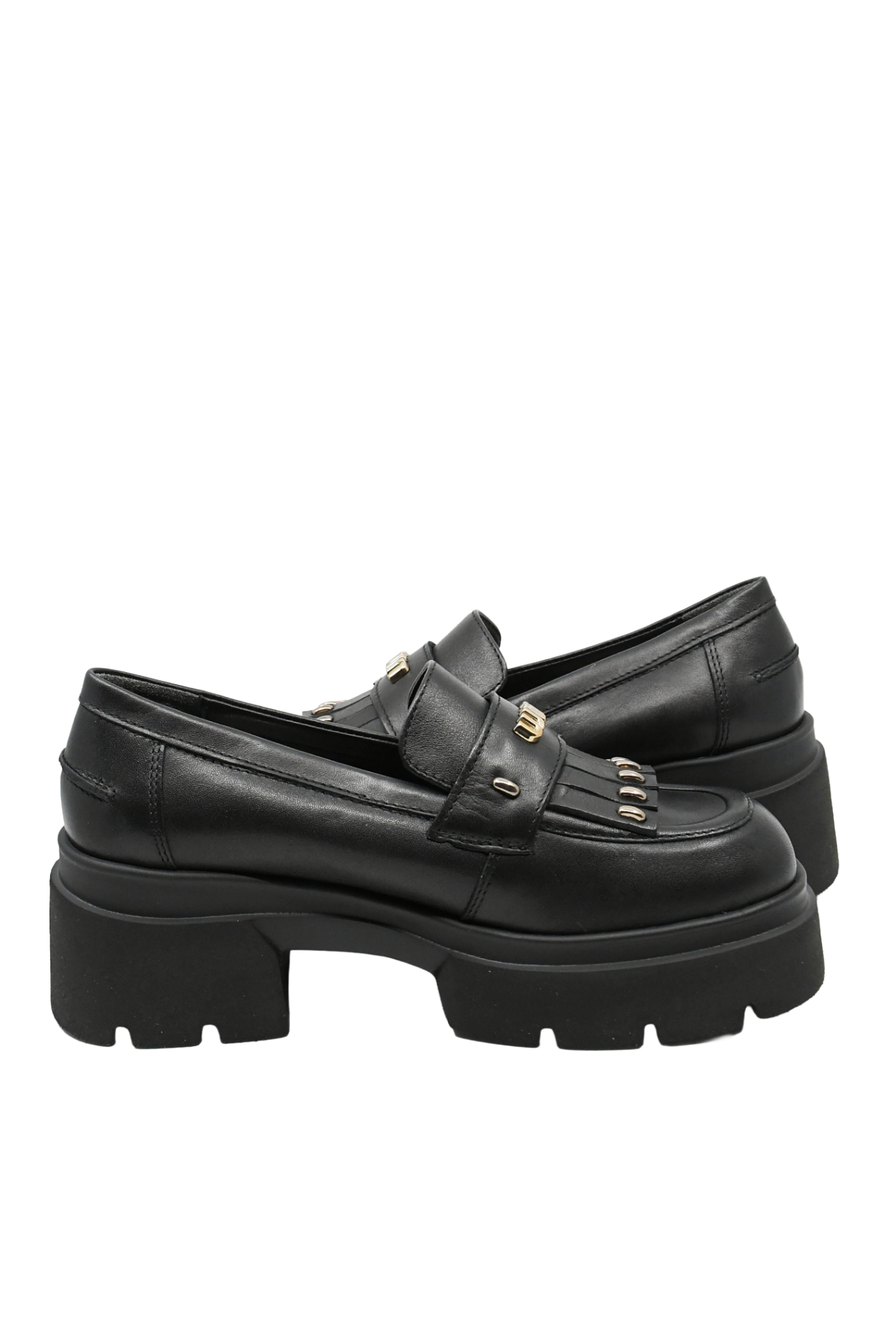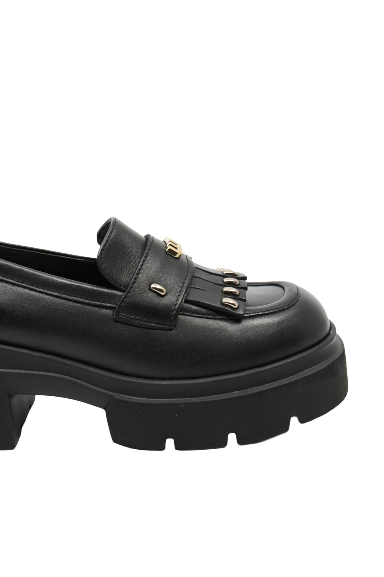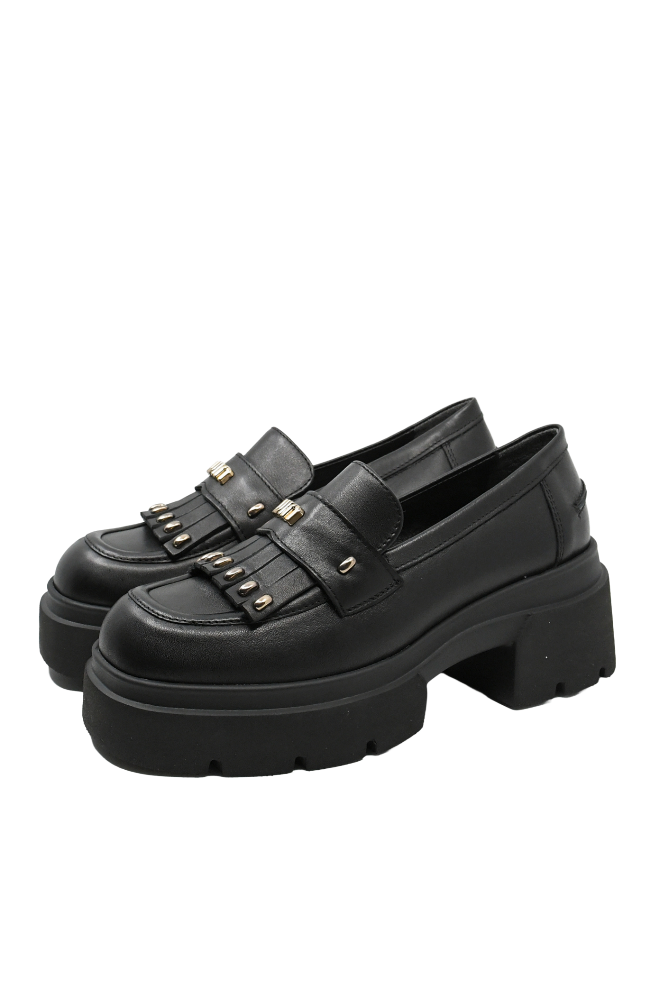 Loaferi damă cu platformă masivă, același look clasic cu ceva în plus, foarte îndrăzneț. Cu detalii decorative aurii metalice, crampoane, vârf pătrat, sunt mai mult decât pantofi, sunt o bijuterie.