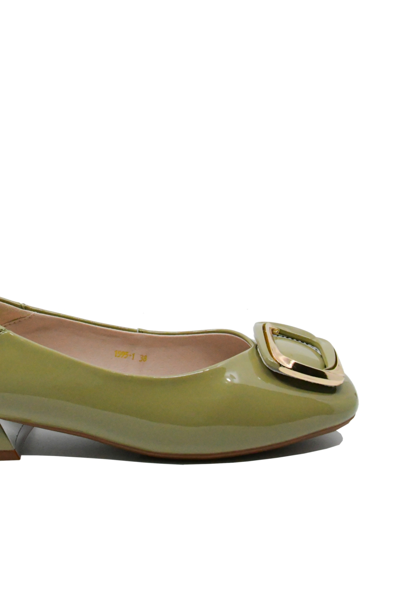 Pantofi din lac în culoarea măslinei, plini de gust și de caracter, cu toc mic și branțuri moi, pe care îi poți purta mereu și mereu cu plăcere.
