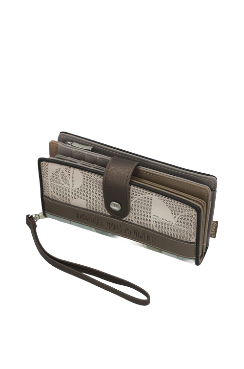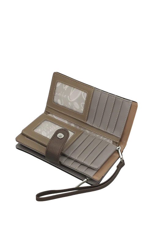 Portofel mediu Anekke rigid, cu protecție RFID și închidere cu fermoar plus clapetă cu capsă. Modelul face parte din colecția Auralis, simbolizând o lumină în mișcare, o capsulă a timpului creată din materiale ușoare, cu străluciri subtile și culori ce par să plutească.